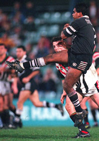 Michael Hawkins once again was in the limelight. He had not had a descent meal in days, except for the oranges at half-time. He is pictured here trying to get a piece of Bruce Johnson, who was busy practising his martial arts skills. What followed was too graphical to show, as Bruce loss his leg.